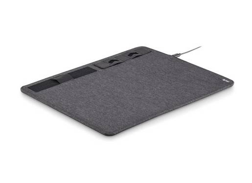 Multifunctional 2-tone mousepad made of 300D polyester RPET with inductive charging station and smartphone holder.