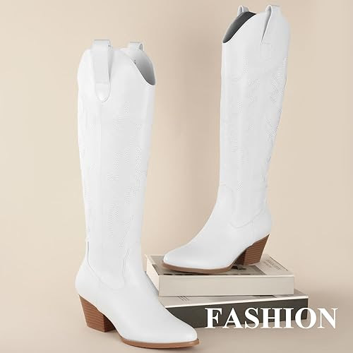 Ankis Women's Black Knee-High Cowboy Boots, Comfortable Cowgirl Boots with Embroidered Design, Pointed Toe, 2.16" Block Heel, Easy On/Off Side Zip