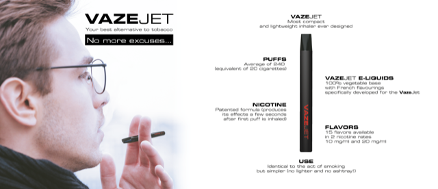 VazeJet is a one-time use inhaler that generates approximately 240 puffs (equivalent of puffs procured by a pack of 20 tobacco cigarettes). It is pre-filled with e-liquids using vegetable propylene glycol, vegetable glycerin and different flavors specifically created in France for the VazeJet.