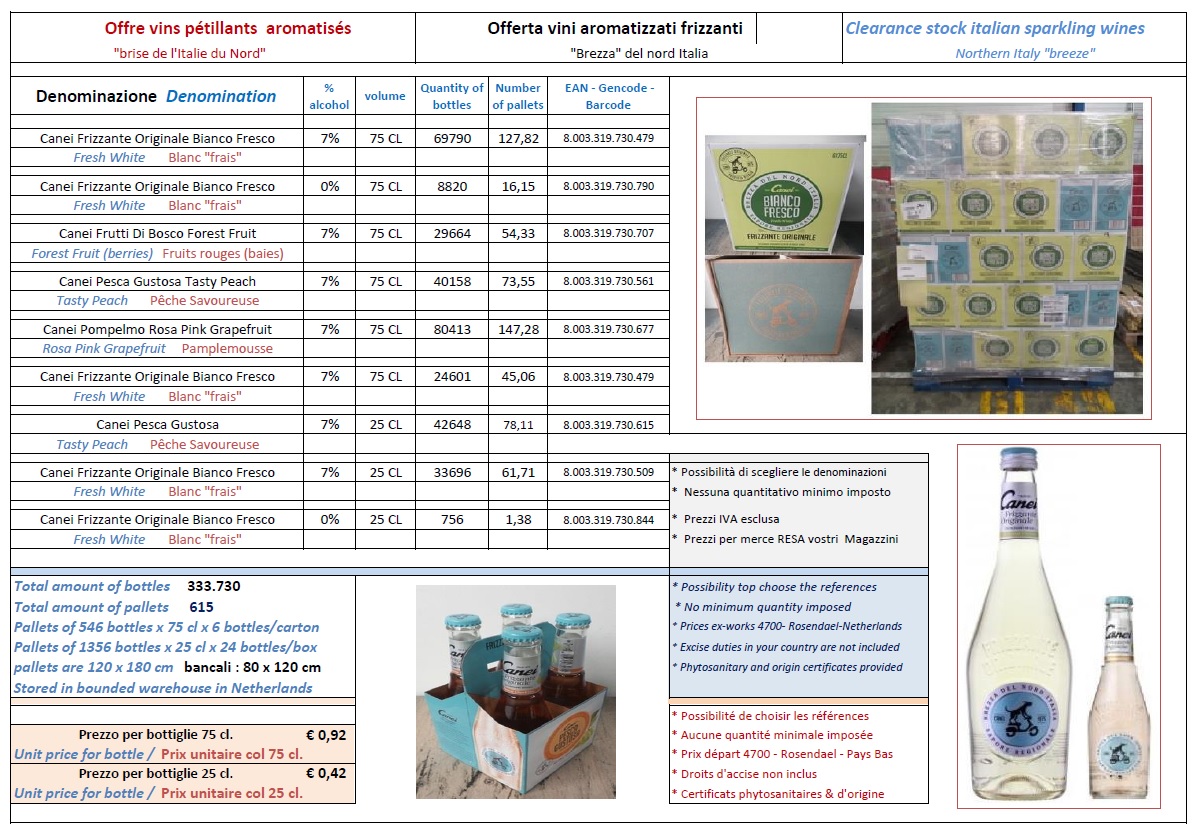 This an offer for a big stock of italian sparkling wines currently in storage at a logistics company in the Netherlands.